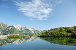 白馬三山や五竜岳といった北アルプスの山々が間近に迫る眺めの素晴らしいコースで、 天気が良い日は八方尾根自然研究路の目的地、 八方池の水面に白馬連峰の山々が映る神秘的な光景に出会えます。